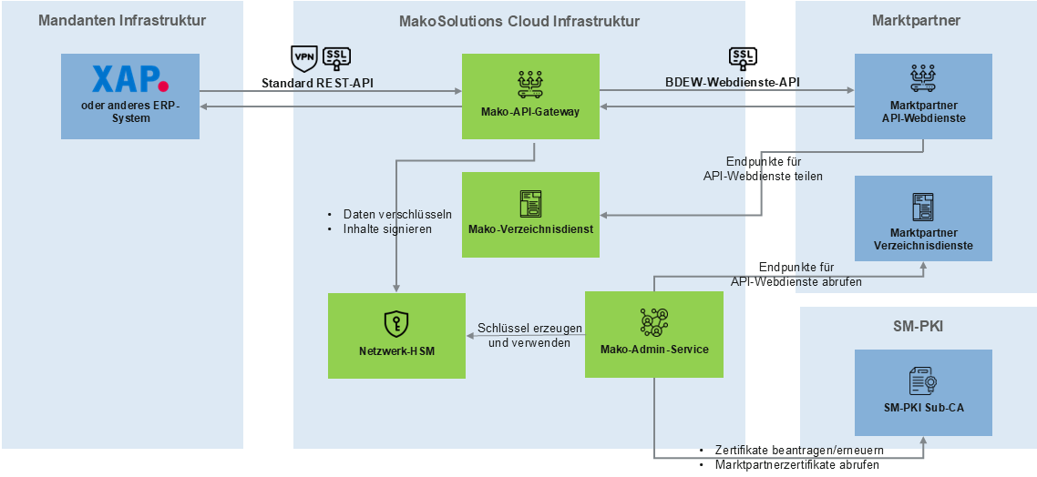 Das Mako-API-Gateway fungiert als TLS-Bridge und ermöglicht einen sicheren und spezifikationskonformen Verbindungsaufbau zwischen verschiedenen Marktteilnehmern. Die Absicherung der Kommunikation über API-Webdienste definierte die Richtline „Kryptographische Vorgaben für Projekte der Bundesregierung“ (BSI TR-03116–3). Das Ziel dieser Richtlinie ist eine sichere Maschinen–Maschinen-Kommunikation mit Direktverarbeitung. Unsere Lösung für die API-Webdienste ist hochskalierbar, hochverfügbar und über gut dokumentierte Schnittstellen einfach in bestehende Systemlandschaften integrierbar.